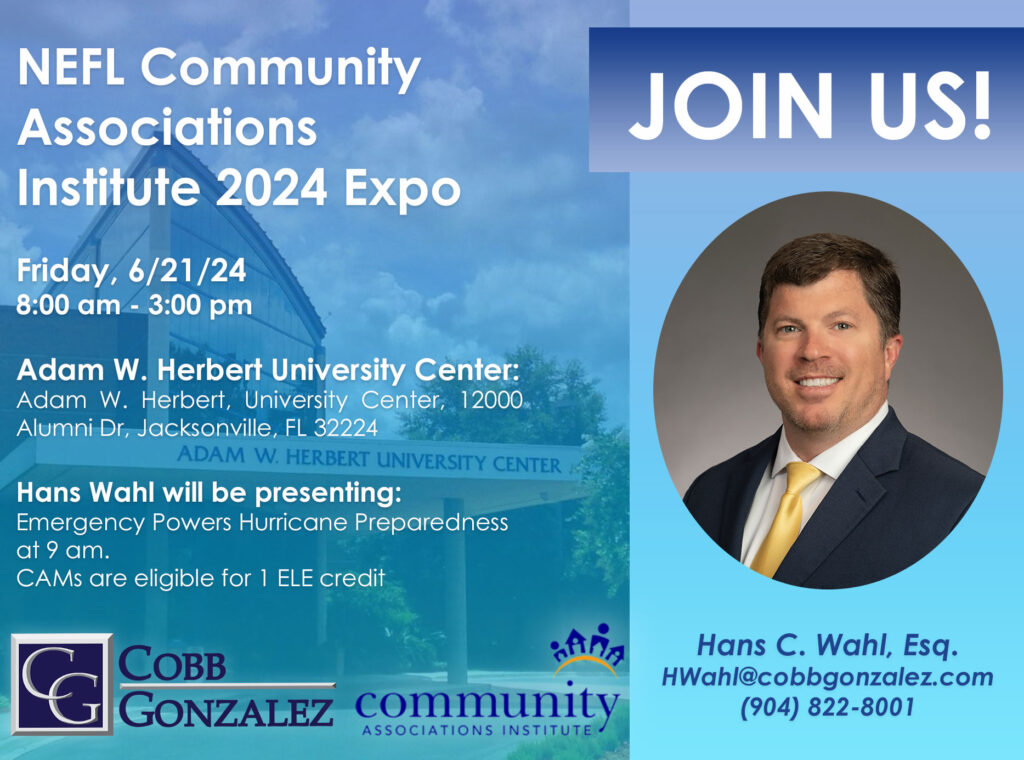 Join us next Friday at UNF! Hans C. Wahl will be presenting Emergency Powers Hurricane Preparedness at the 2024 NEFL CAI expo! His class will begin at 9 am, followed by a live Q&A. This event offers a variety of courses for those in the community association industry to expand their knowledge and their network! Contact us with any questions: LHughes@cobbgonzalez.com.